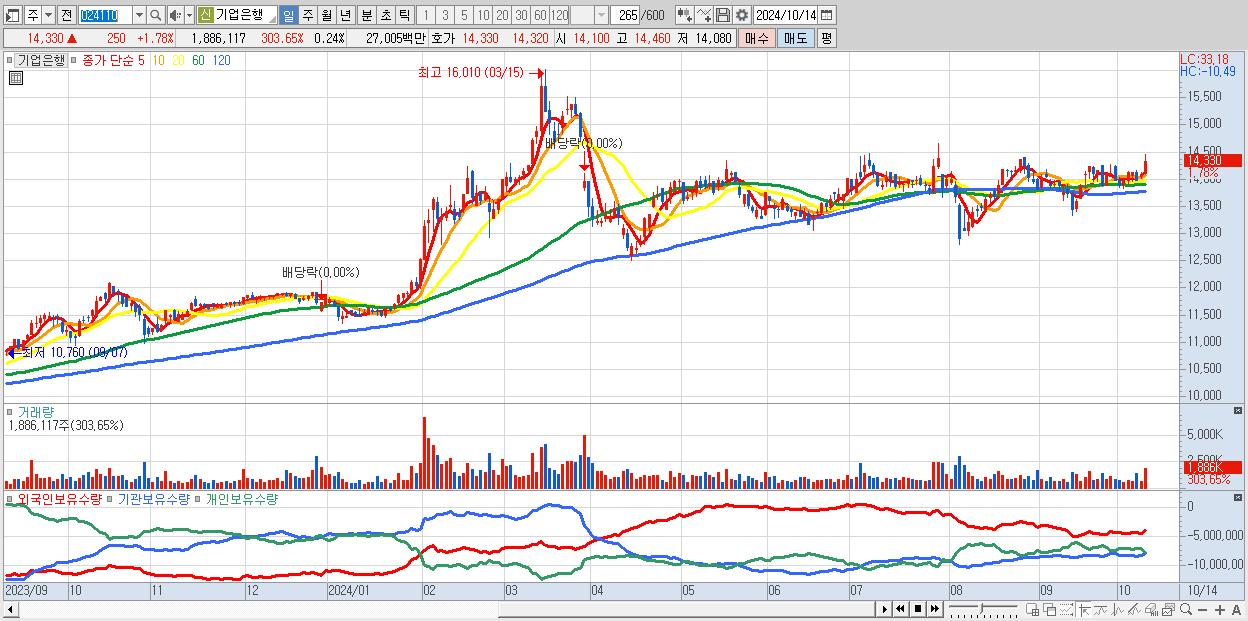 - 기업은행 (14,330원 ▲ 1.78% , 시총: 114,271억, 외국인 순매수 거래금:74억)