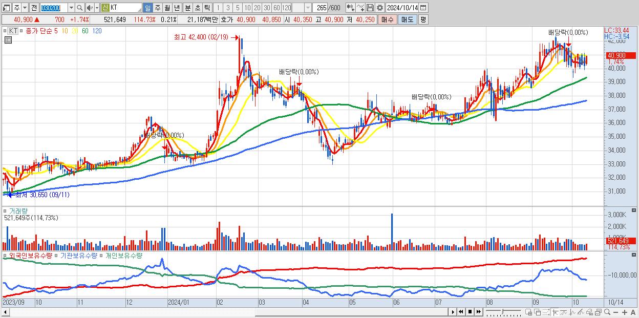 - KT (40,900원 ▲ 1.74% , 시총: 103,077억, 외국인 순매수 거래금:59억)