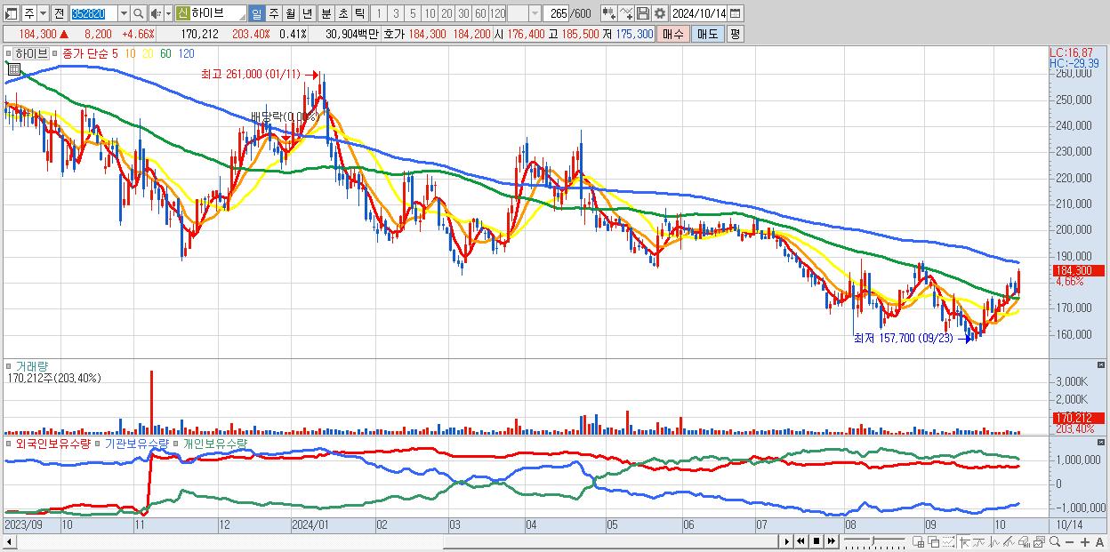 - 하이브 (184,300원 ▲ 4.66% , 시총: 76,765억, 외국인 순매수 거래금:62억)