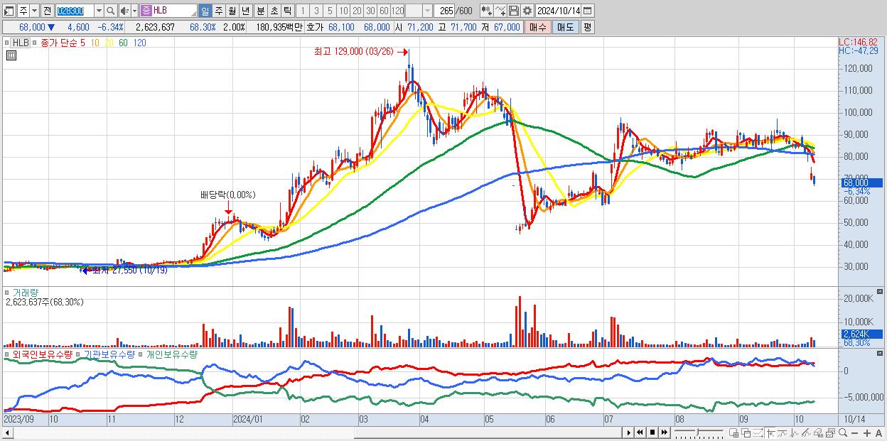 - HLB (68,000원 ▼ -6.34% , 시총: 89,167억, 외국인 순매수 거래금:67억)