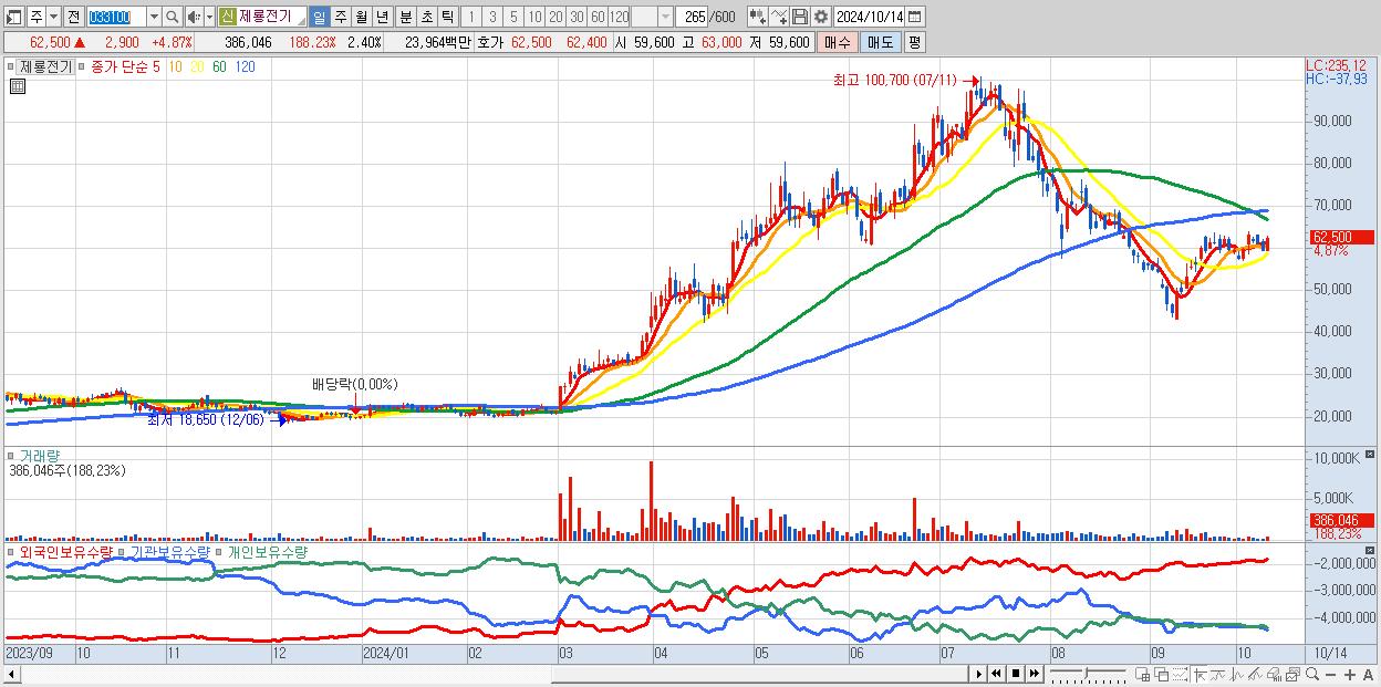 - 제룡전기 (62,500원 ▲ 4.87% , 시총: 10,039억, 외국인 순매수 거래금:62억)