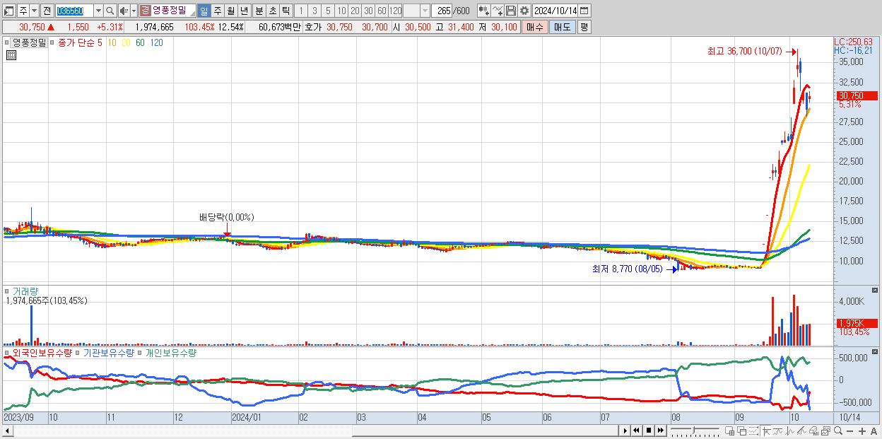 - 영풍정밀 (30,750원 ▲ 5.31% , 시총: 4,843억, 외국인 순매수 거래금:77억)