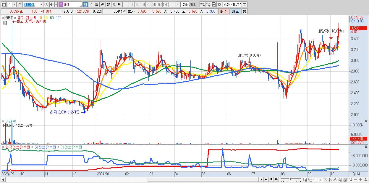 - GRT (3,595원 ▲ 4.81% , 시총: 2,422억, 거래량: 149,618, 거래대금:5억, KOSDAQ)