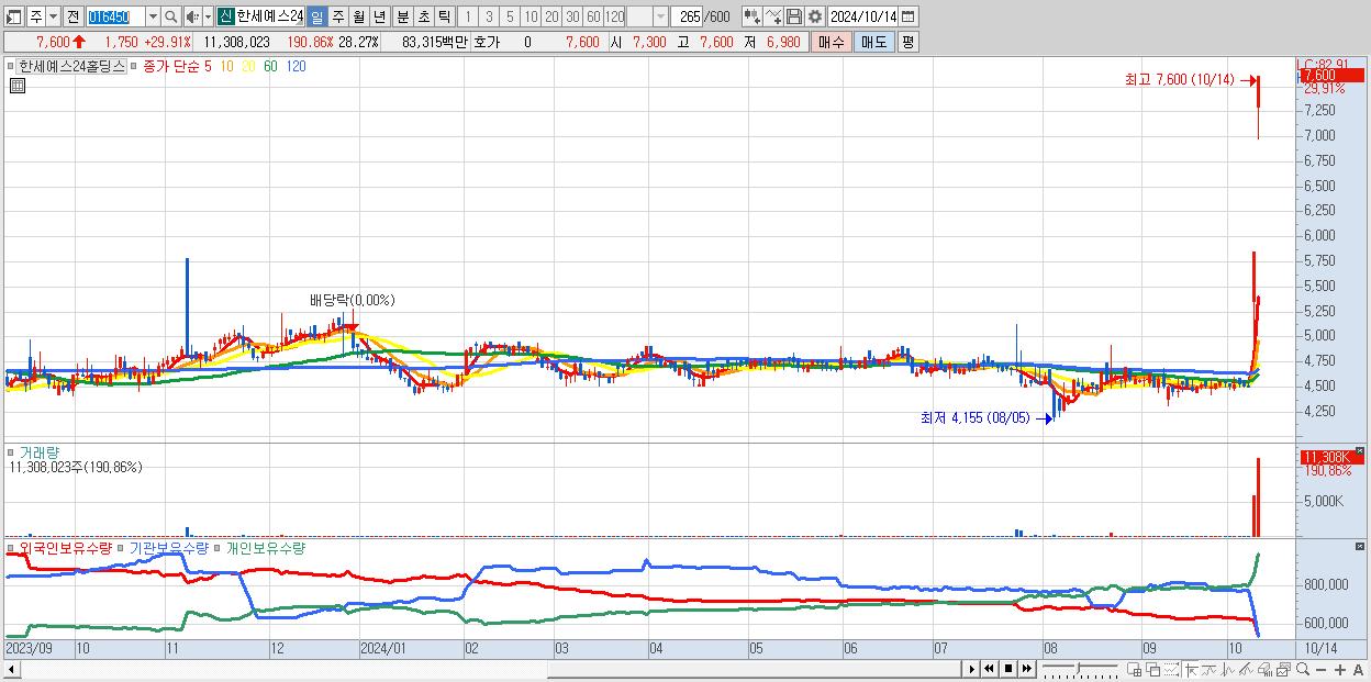 - 한세예스24홀딩스 (7,600원 ▲ 29.91% , 시총: 3,040억, 거래량: 11,308,023, 거래대금:833억, KOSPI)