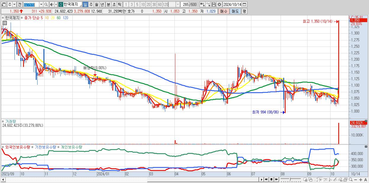 - 한국제지 (1,350원 ▲ 29.93% , 시총: 2,567억, 거래량: 24,602,423, 거래대금:313억, KOSPI)