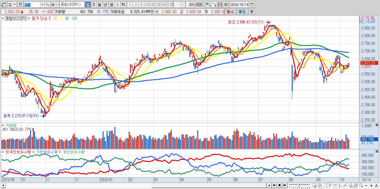 | 10/14 | 2,623.29 | ▲1.02% | -4,562억 | 904억 | 3,282억 | 376억 |