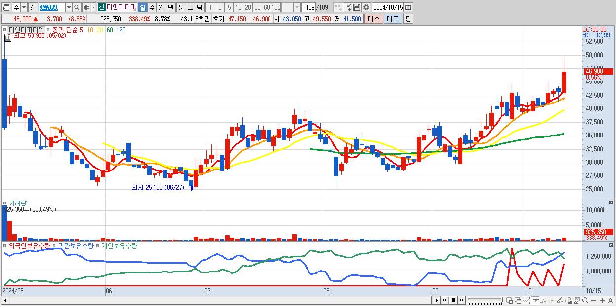- 디앤디파마텍 (46,900원 ▲ 8.56% , 시총: 4,943억, 외국인 순매수 거래금:48억)