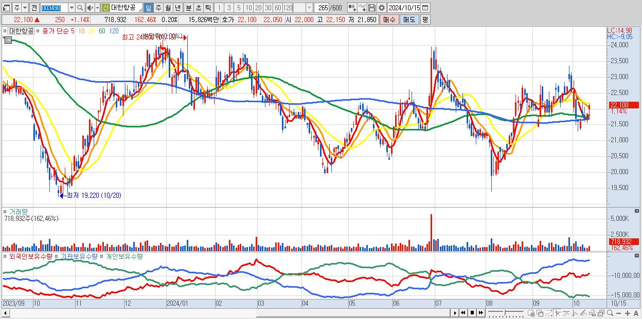 - 대한항공 (22,100원 ▲ 1.14% , 시총: 81,377억, 외국인 순매수 거래금:56억)