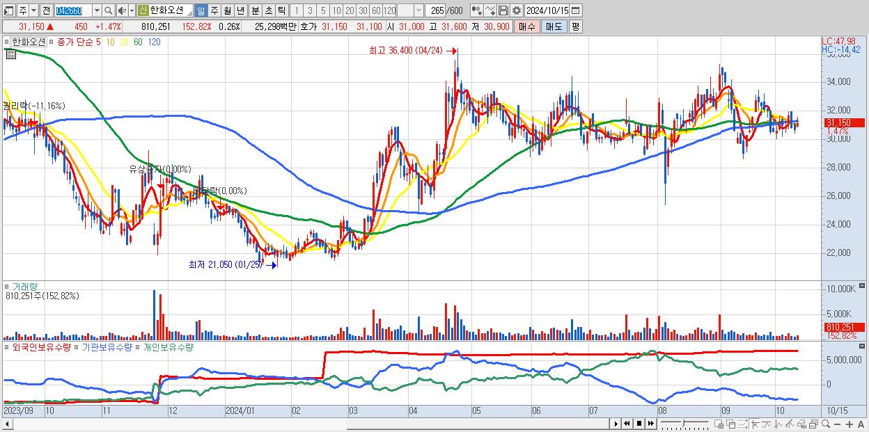 - 한화오션 (31,150원 ▲ 1.47% , 시총: 95,448억, 외국인 순매수 거래금:54억)