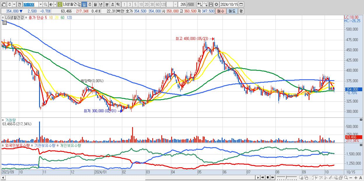 - LG생활건강 (354,000원 ▼ -0.7% , 시총: 55,288억, 외국인 순매수 거래금:40억)