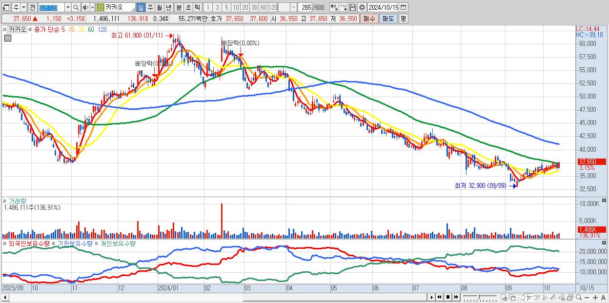 - 카카오 (37,650원 ▲ 3.15% , 시총: 166,989억, 외국인 순매수 거래금:243억)
