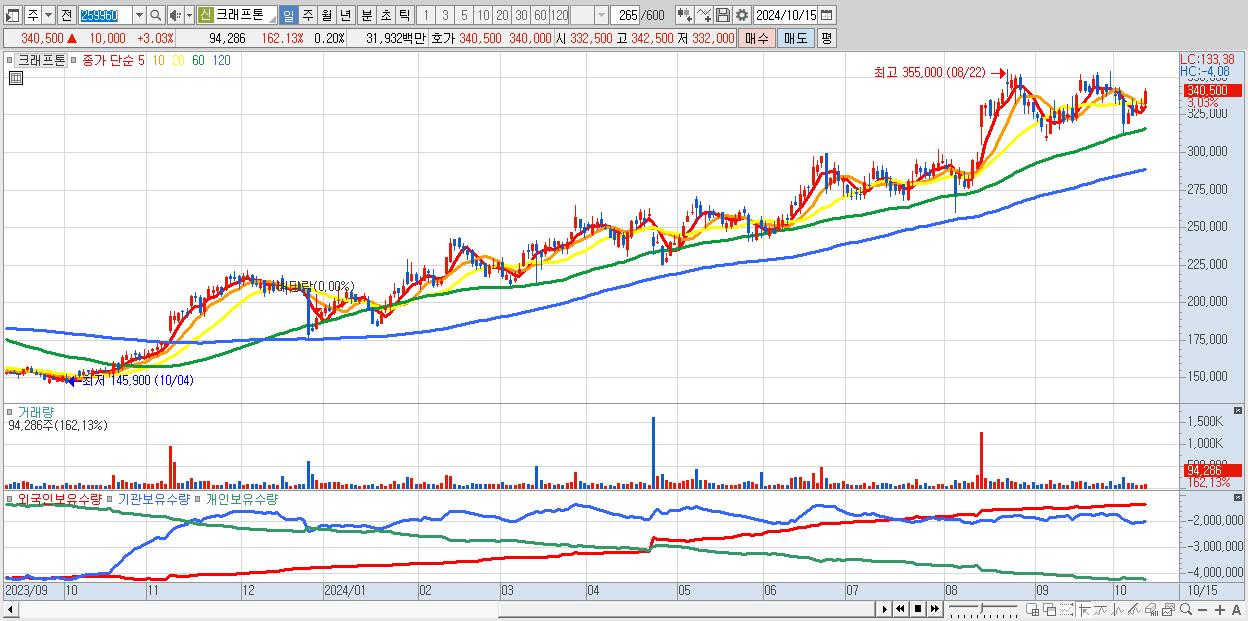 - 크래프톤 (340,500원 ▲ 3.03% , 시총: 163,089억, 외국인 순매수 거래금:95억)