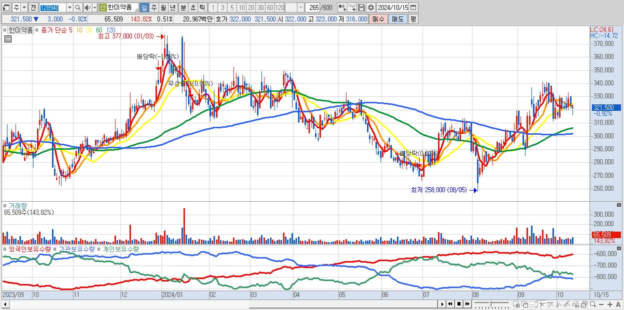 - 한미약품 (321,500원 ▼ -0.92% , 시총: 41,187억, 외국인 순매수 거래금:40억)