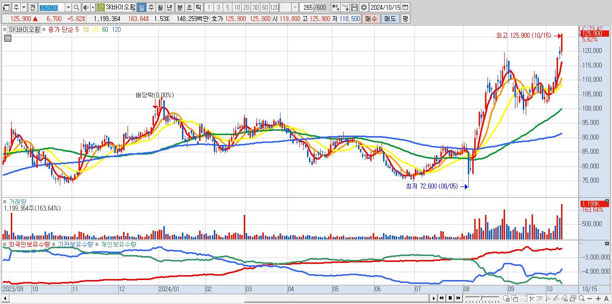 - SK바이오팜 (125,900원 ▲ 5.62% , 시총: 98,596억, 외국인 순매수 거래금:109억)