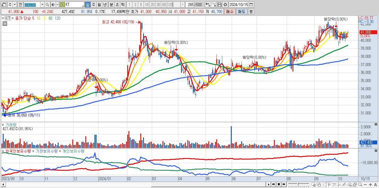 - KT (41,000원 ▲ 0.24% , 시총: 103,329억, 외국인 순매수 거래금:75억)