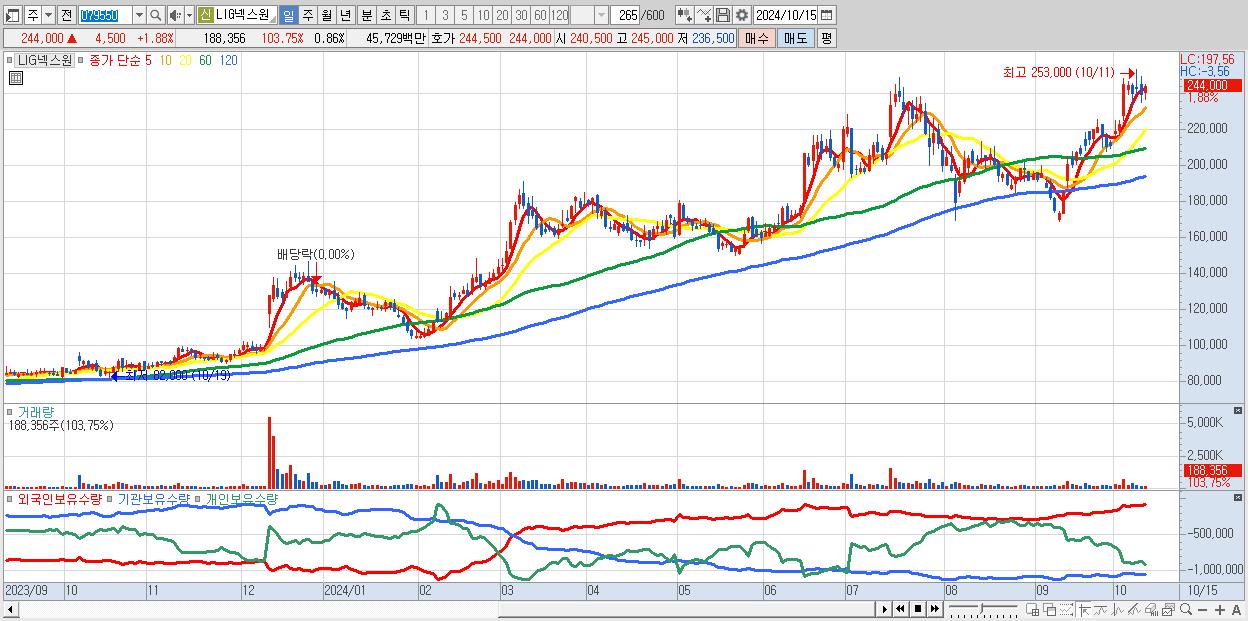 - LIG넥스원 (244,000원 ▲ 1.88% , 시총: 53,680억, 외국인 순매수 거래금:58억)