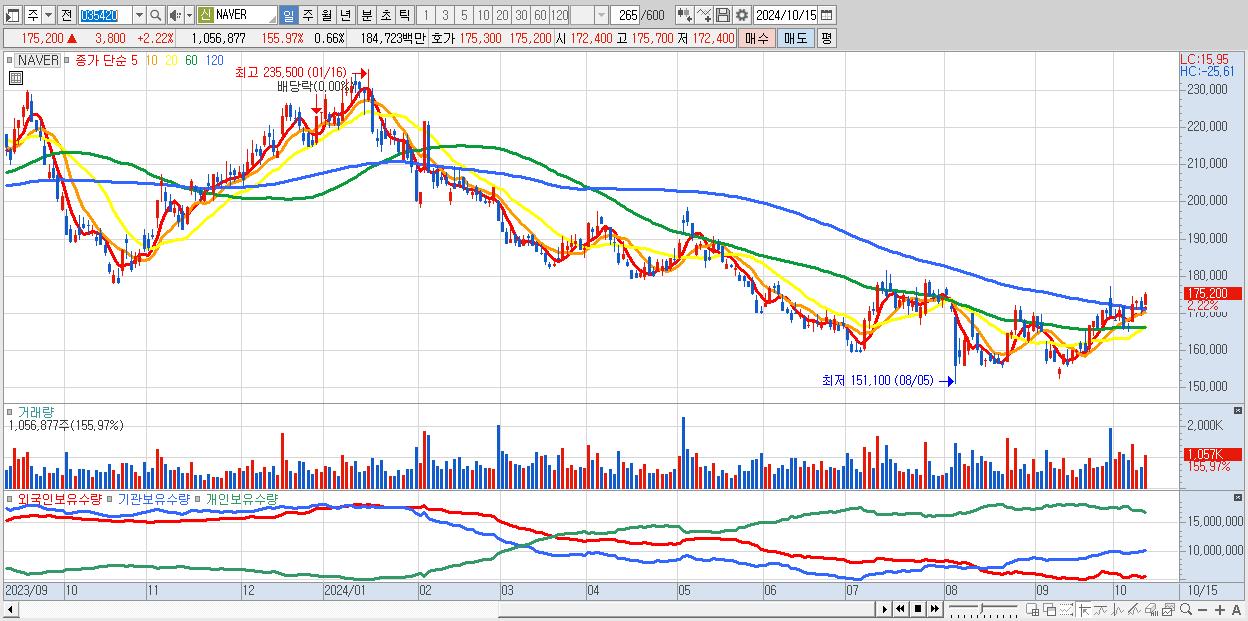 - NAVER (175,200원 ▲ 2.22% , 시총: 281,694억, 외국인 순매수 거래금:100억)