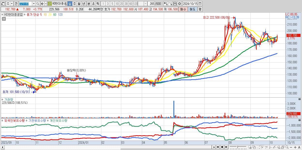 - HD현대중공업 (192,700원 ▲ 3.77% , 시총: 171,066억, 외국인 순매수 거래금:135억)