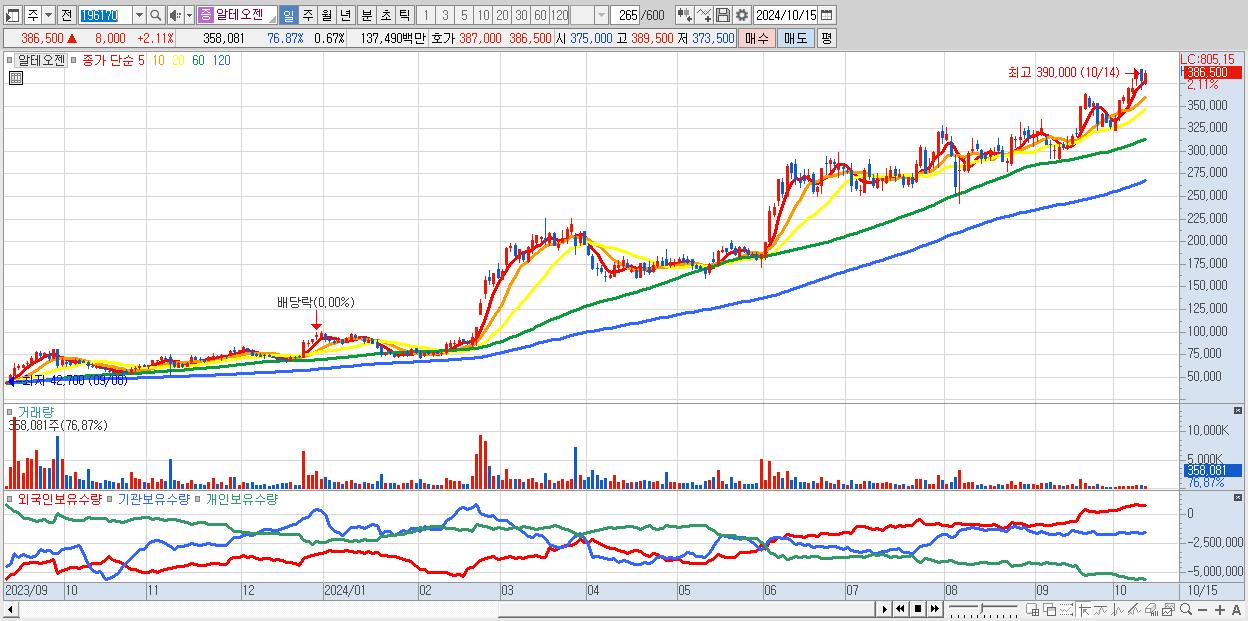- 알테오젠 (386,500원 ▲ 2.11% , 시총: 205,419억, 외국인 순매수 거래금:195억)