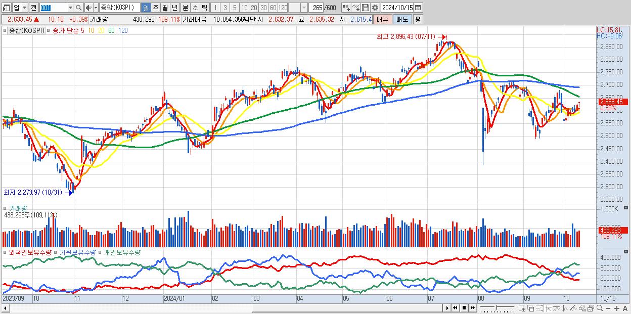 10/15 | 2,633.45 | ▲0.39% | -3,436억 | 2,878억 | 117억 | 441억 |