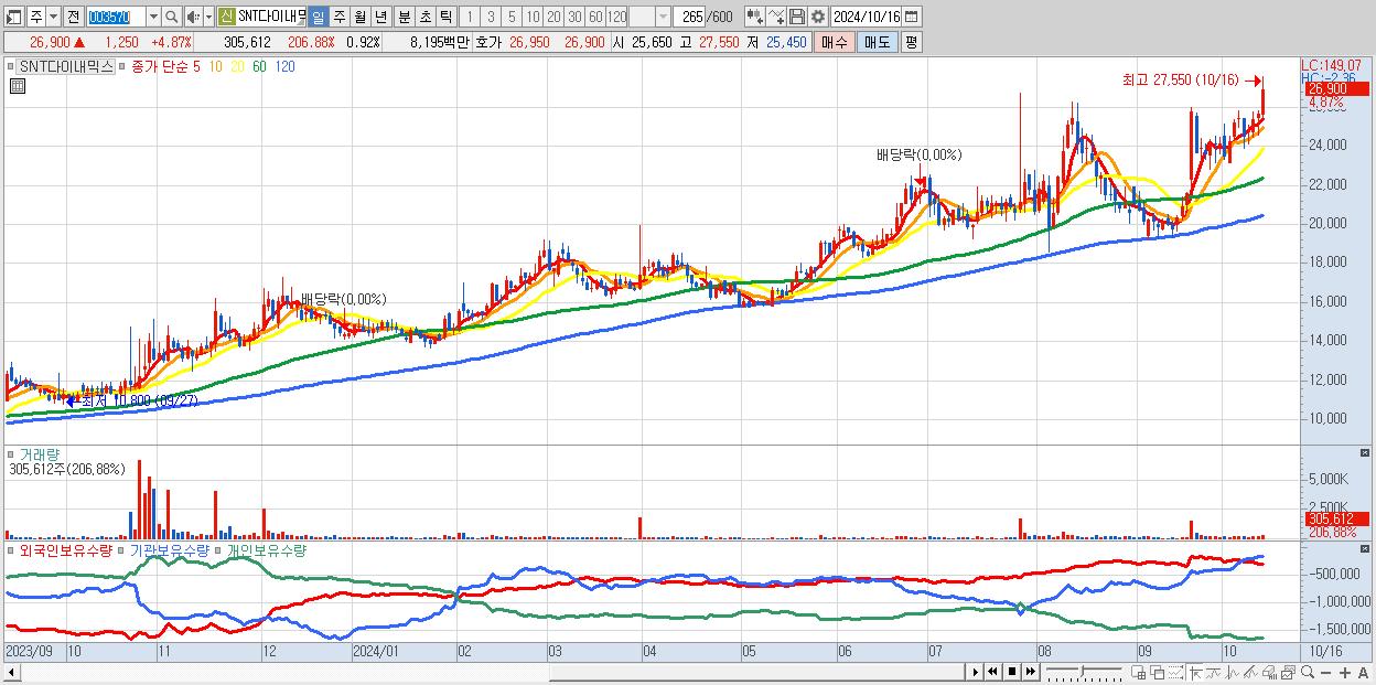 - SNT다이내믹스 (26,900원 ▲ 4.87% , 시총: 8,945억, 거래량: 305,612, 거래대금:82억, KOSPI)