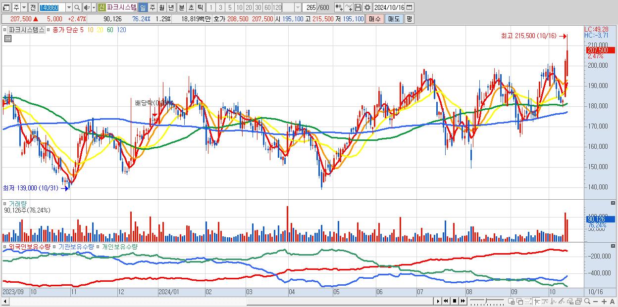 - 파크시스템스 (207,500원 ▲ 2.47% , 시총: 14,491억, 거래량: 90,126, 거래대금:188억, KOSDAQ)