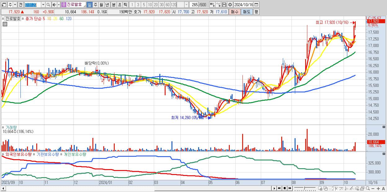 - 진로발효 (17,920원 ▲ 0.9% , 시총: 1,187억, 거래량: 10,664, 거래대금:2억, KOSDAQ)