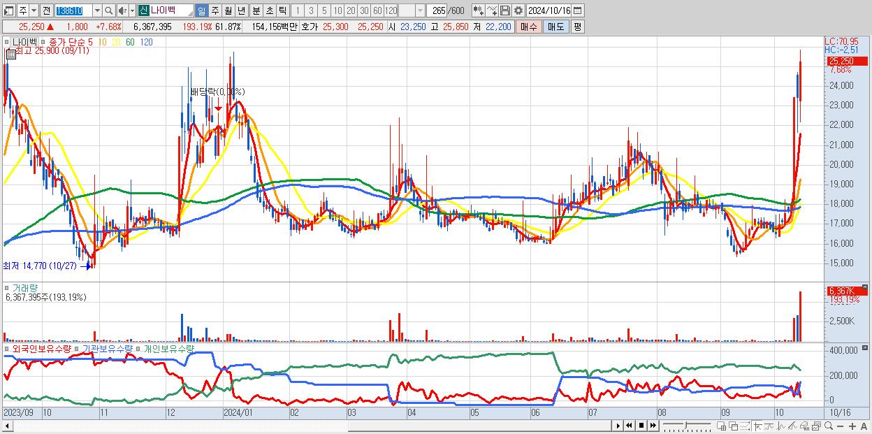 - 나이벡 (25,250원 ▲ 7.68% , 시총: 2,599억, 거래량: 6,367,395, 거래대금:1,542억)