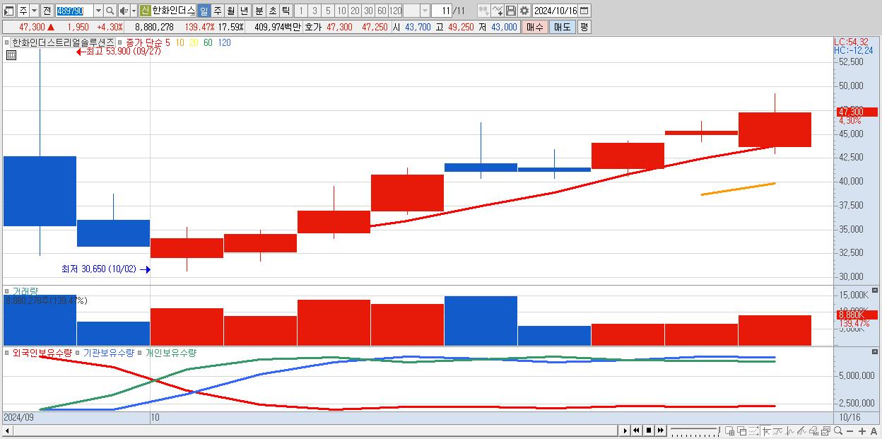 - 한화인더스트리얼솔루션즈 (47,300원 ▲ 4.3% , 시총: 23,881억, 거래량: 8,880,278, 거래대금:4,100억)