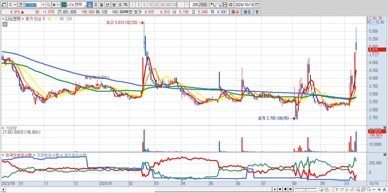 - 나노엔텍 (4,915원 ▲ 1.87% , 시총: 1,578억, 거래량: 27,651,826, 거래대금:1,439억)