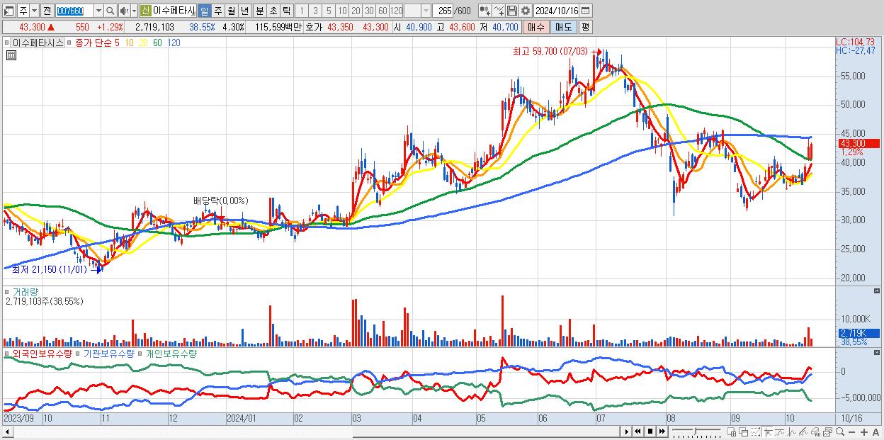 - 이수페타시스 (43,300원 ▲ 1.29% , 시총: 27,386억, 거래량: 2,719,103, 거래대금:1,156억)