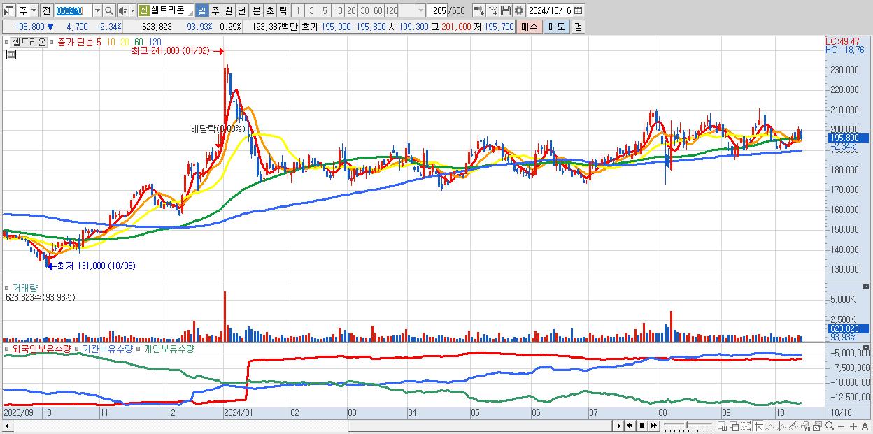 - 셀트리온 (195,800원 ▼ -2.34% , 시총: 424,927억, 거래량: 623,823, 거래대금:1,234억)
