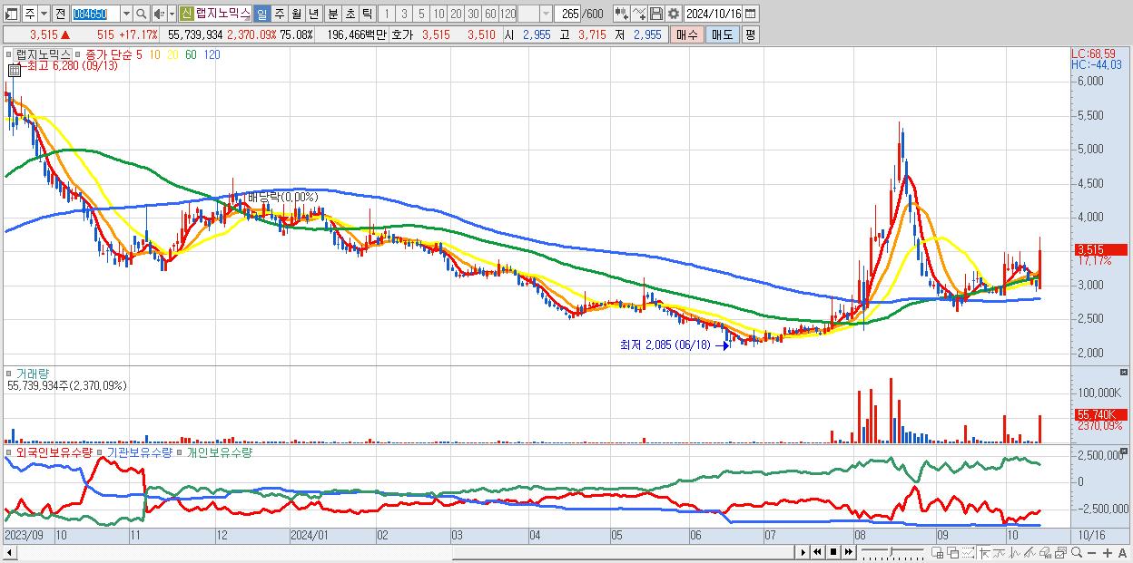 - 랩지노믹스 (3,515원 ▲ 17.17% , 시총: 2,610억, 거래량: 55,739,934, 거래대금:1,965억)