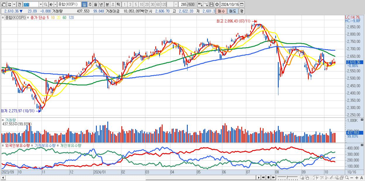 | 10/16 | 2,610.36 | ▼-0.88% | 6,535억 | -6,574억 | -400억 | 440억 |