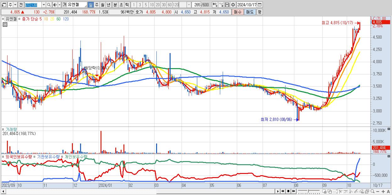 - 유엔젤 (4,805원 ▲ 2.78% , 시총: 634억, 거래량: 201,484, 거래대금:10억, KOSPI)