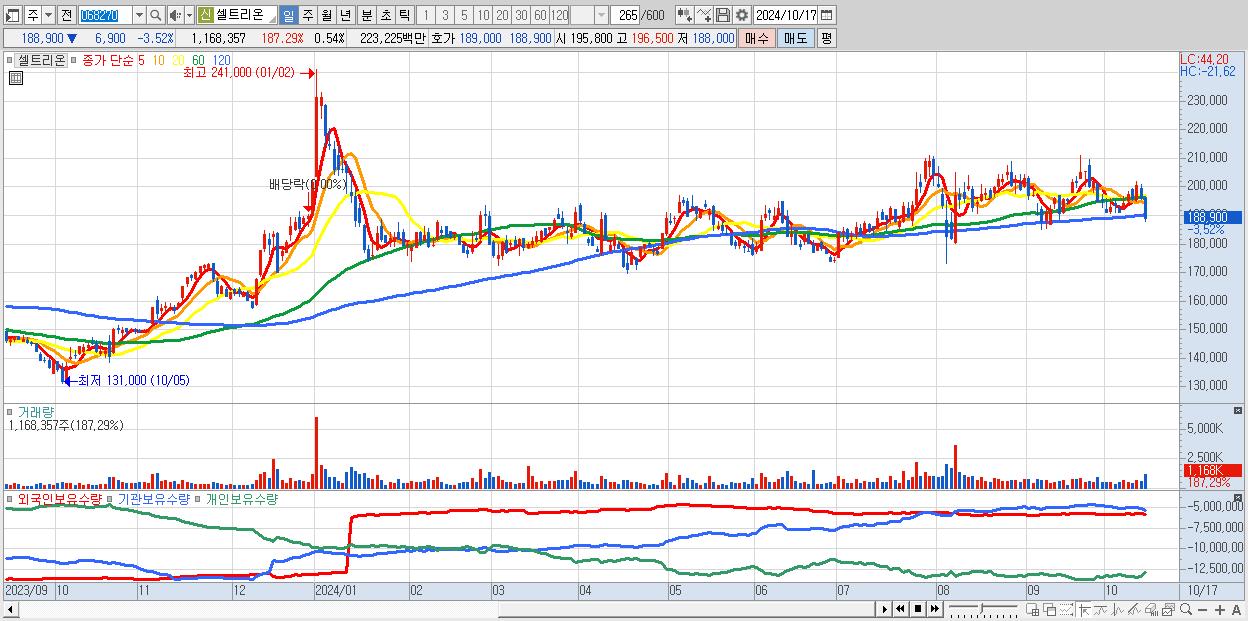 - 셀트리온 (188,900원 ▼ -3.52% , 시총: 409,953억, 거래량: 1,168,357, 거래대금:2,232억)