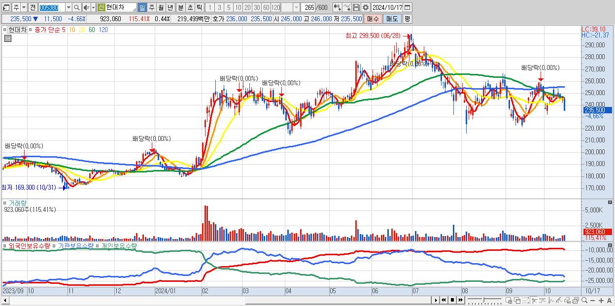 - 현대차 (235,500원 ▼ -4.66% , 시총: 493,175억, 거래량: 923,060, 거래대금:2,195억)