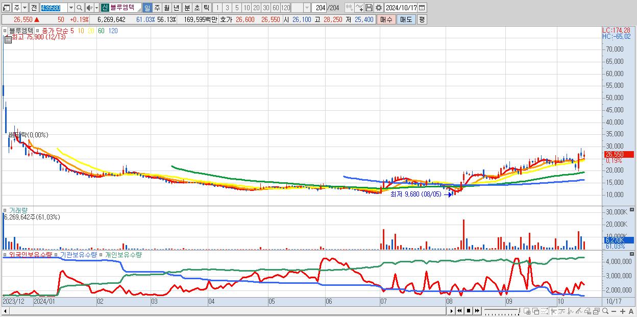 - 블루엠텍 (26,550원 ▲ 0.19% , 시총: 2,966억, 거래량: 6,269,642, 거래대금:1,696억)