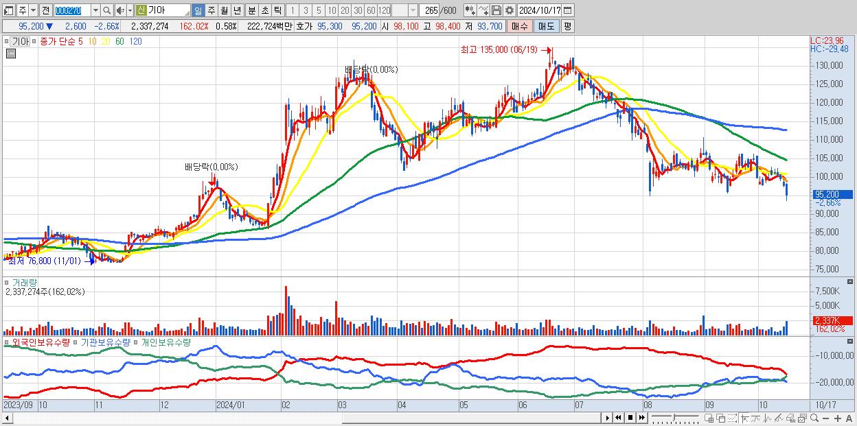- 기아 (95,200원 ▼ -2.66% , 시총: 380,665억, 거래량: 2,337,274, 거래대금:2,227억)