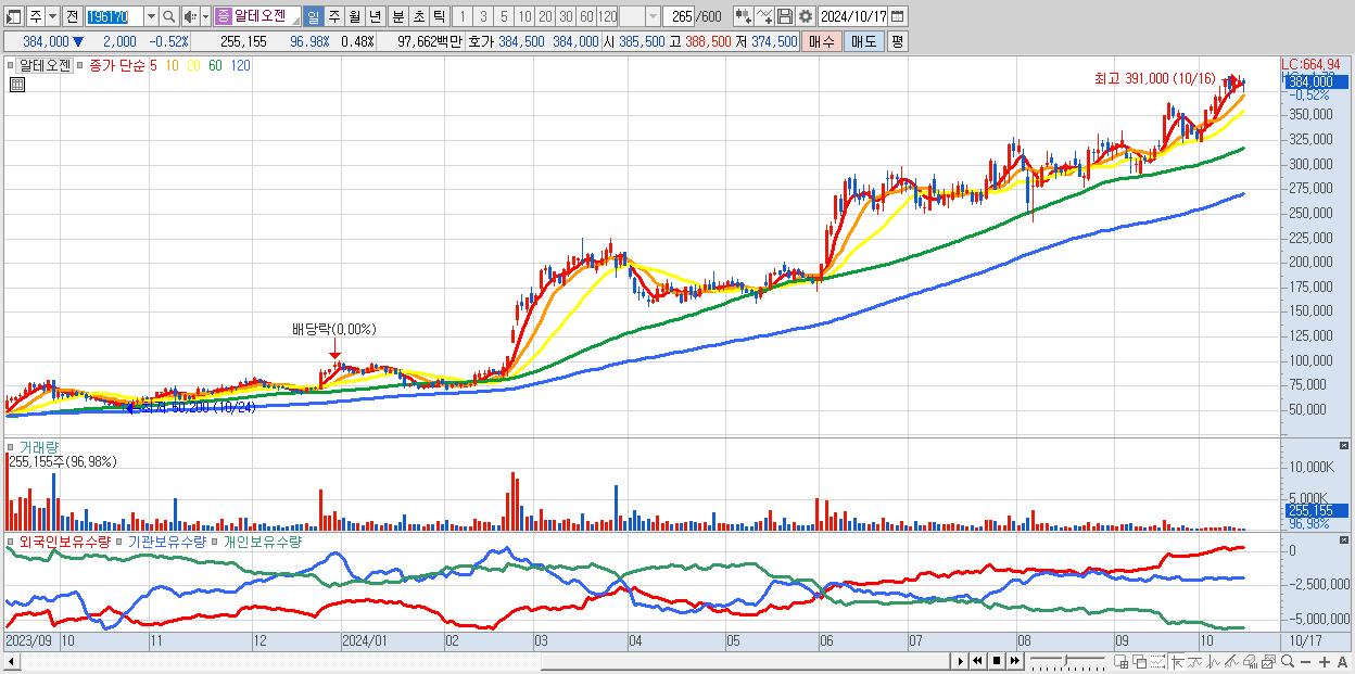 - 알테오젠 (384,000원 ▼ -0.52% , 시총: 204,090억, 거래량: 255,155, 거래대금:977억)