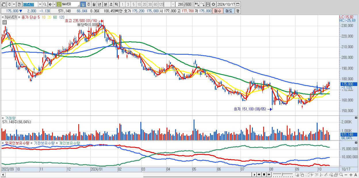 - NAVER (175,000원 ▼ -1.13% , 시총: 281,373억, 거래량: 571,148, 거래대금:1,005억)