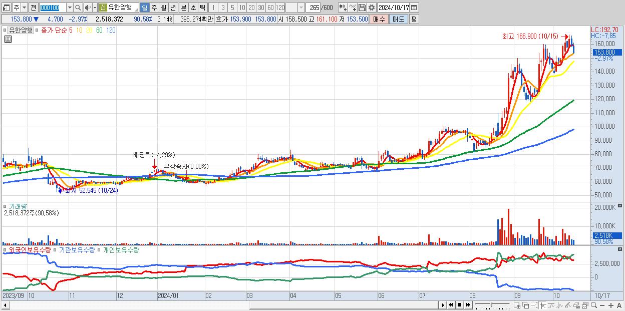 - 유한양행 (153,800원 ▼ -2.97% , 시총: 123,362억, 거래량: 2,518,372, 거래대금:3,953억)