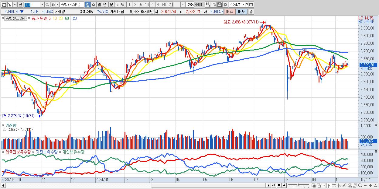 | 10/17 | 2,609.30 | ▼-0.04% | 1,615억 | -4,044억 | 2,007억 | 423억 |