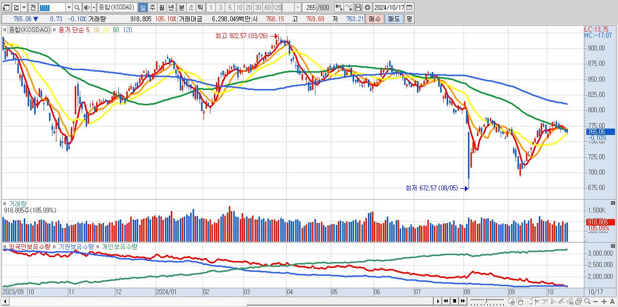 | 10/17 | 765.06 | ▼-0.10% | 351억 | 32억 | -268억 | -116억 |