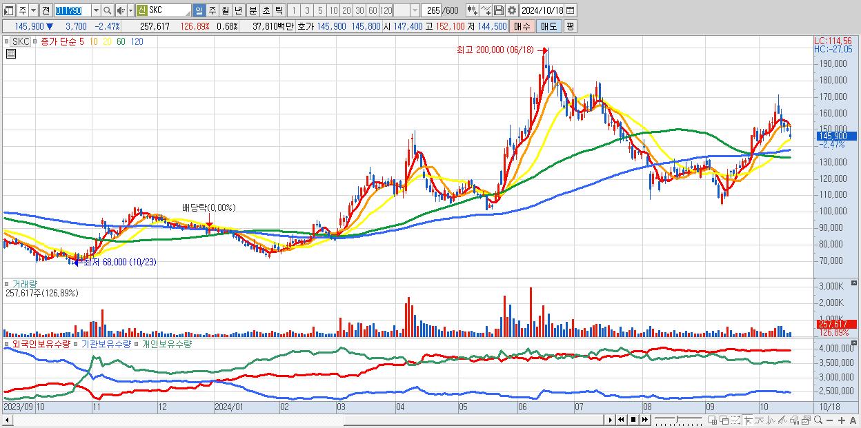 - SKC (145,900원 ▼ -2.47% , 시총: 55,250억, 외국인 순매수 거래금:38억)