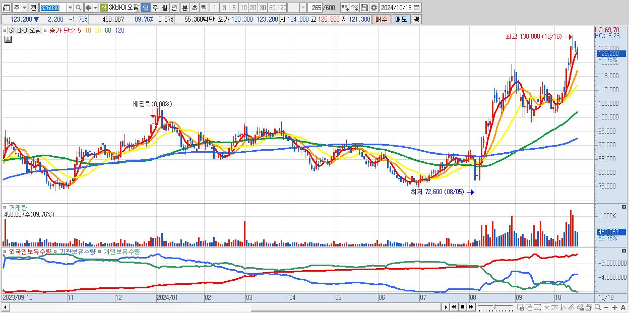 - SK바이오팜 (123,200원 ▼ -1.75% , 시총: 96,482억, 외국인 순매수 거래금:89억)