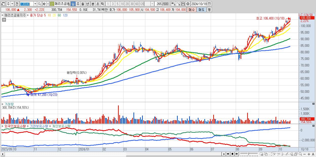 - 메리츠금융지주 (106,000원 ▲ 2.22% , 시총: 202,163억, 거래량: 300,704, 거래대금:317억, KOSPI)