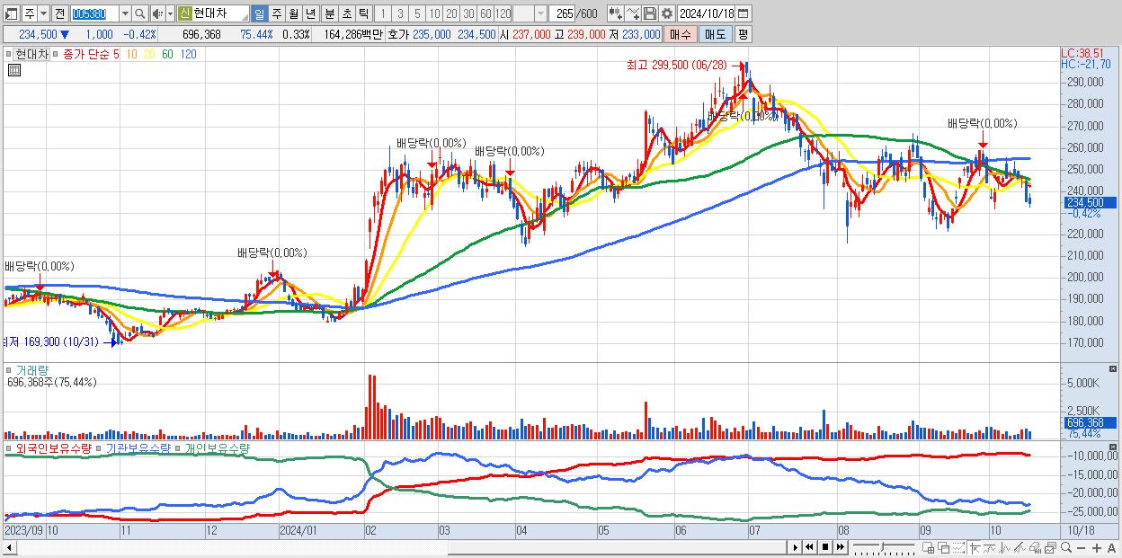 - 현대차 (234,500원 ▼ -0.42% , 시총: 491,081억, 거래량: 696,368, 거래대금:1,643억)