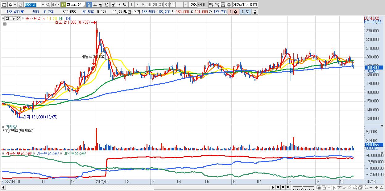 - 셀트리온 (188,400원 ▼ -0.26% , 시총: 408,868억, 거래량: 590,055, 거래대금:1,115억)