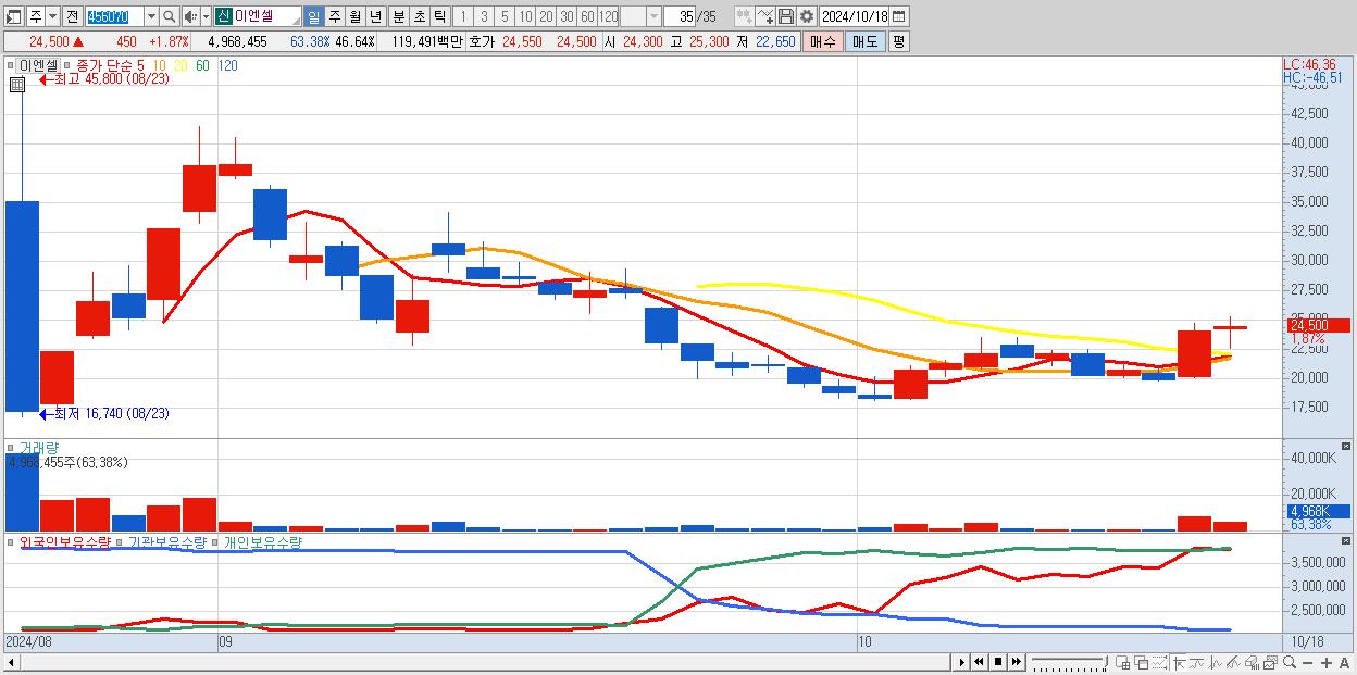 - 이엔셀 (24,500원 ▲ 1.87% , 시총: 2,610억, 거래량: 4,968,455, 거래대금:1,195억)